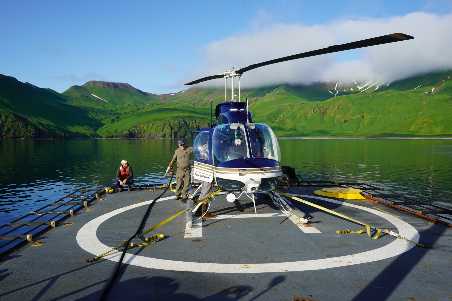 - The aft top deck has been reinforced structurally and the pipe rails have been modified to fold down, creating a landing pad for helicopter operations.